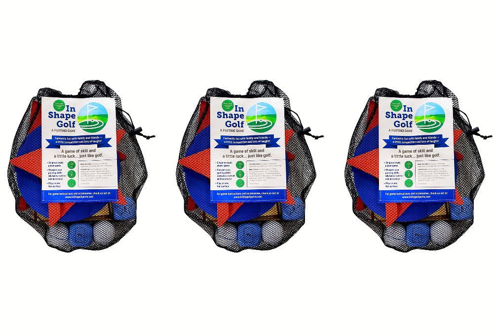 Each game includes 5 Shapes, 2 golf balls, 2 custom 1.5" wooden dice, scorecard, mesh storage bag